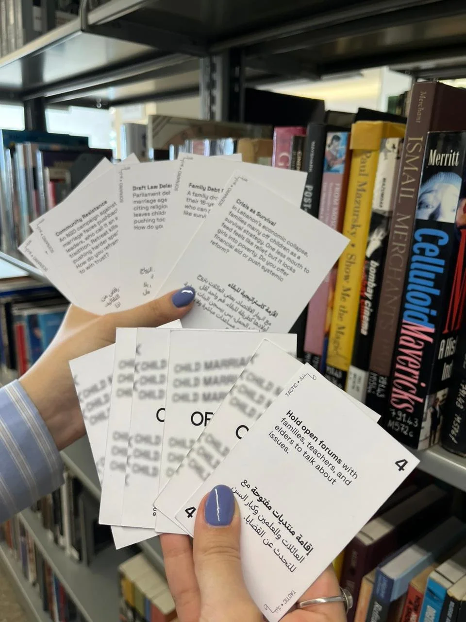 A print-and-ready, bilingual, strategy card game (Arabic & English) co-developed by Mish Waata Campaign and Commence Games. Designed as both a learning and advocacy tool, to immerse you in one of Lebanon’s most urgent civic issues: child marriage. You hold the power to safeguard children’s rights. Can you advance #NotBefore18 while families, courts, politicians, and advocates weigh in?
